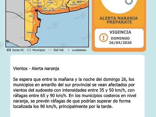 El Municipio de Coronel Rosales informó que, debido al alerta naranja por vientos emitido por el Servicio Meteorológico Nacional, todas las actividades programadas para este domingo 26 de abril quedarán suspendidas en todo el distrito.